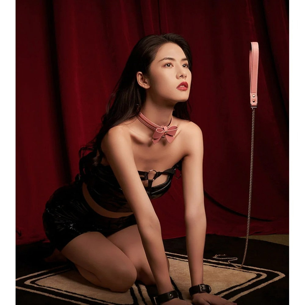 Нашийник з бантиком та повідцем sevanda lockink, шкіра та метал, рожевий. Інтимний товар для дорослих, створений для задоволення та експериментів.