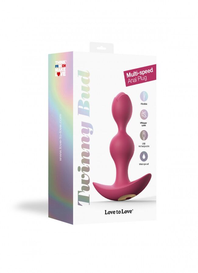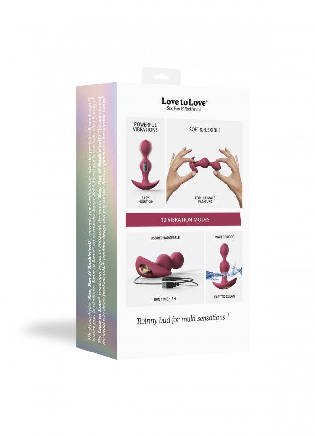 У анального стимулятора Love To Love TWINNY BUD кульки щільні, але не жорсткі, злегка пружні, що ідеально для початківців. Після повної зарядки буде працювати до 90 хвилин.