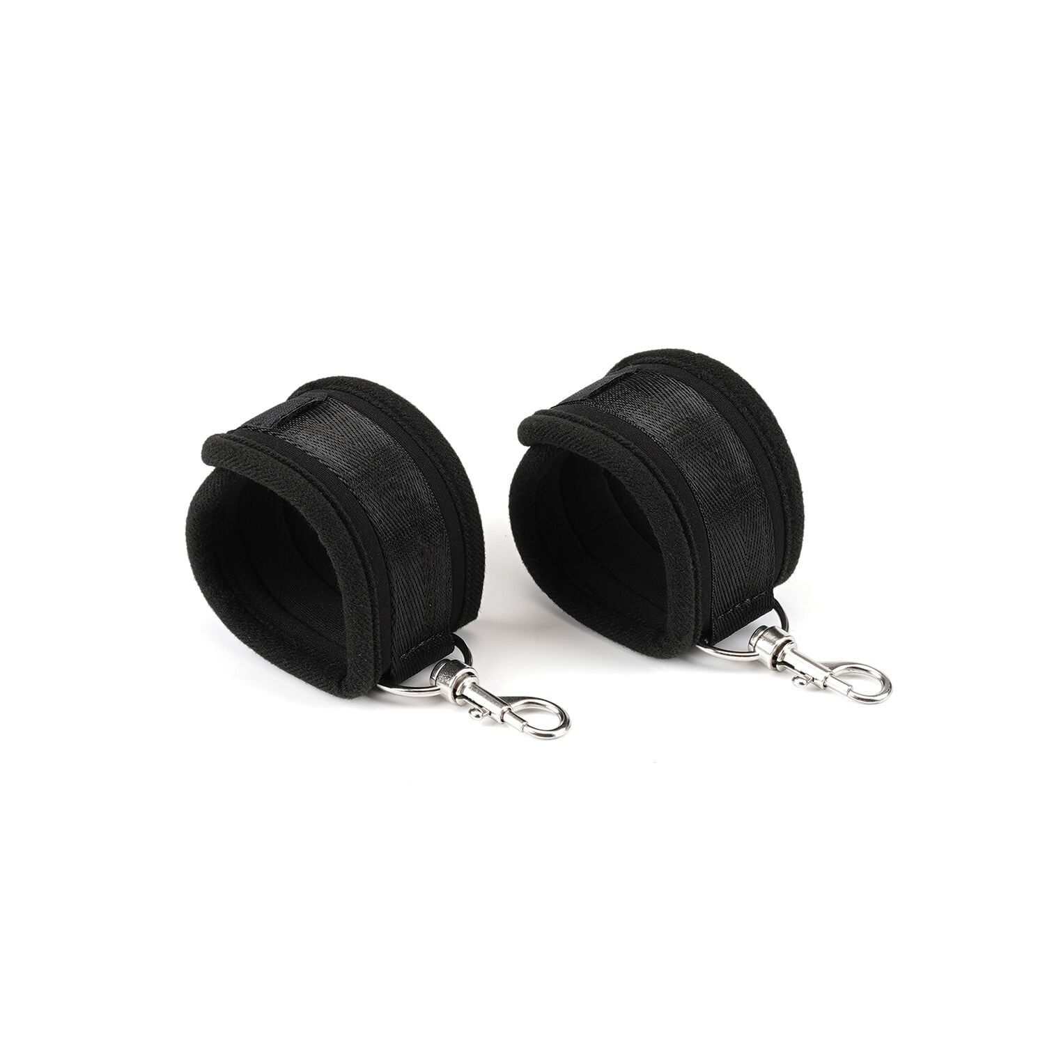 1. Наручники з вільним регулюванням, на липучках. Широкі та м’які, вони надійно зафіксують руки у вибраній позиції. Оснащені карабінами для з’єднання один з одним, з ногами, нашийником, повідцем і тим, чим вам заманеться. Довжина: 25 см, ширина 5,5 см.