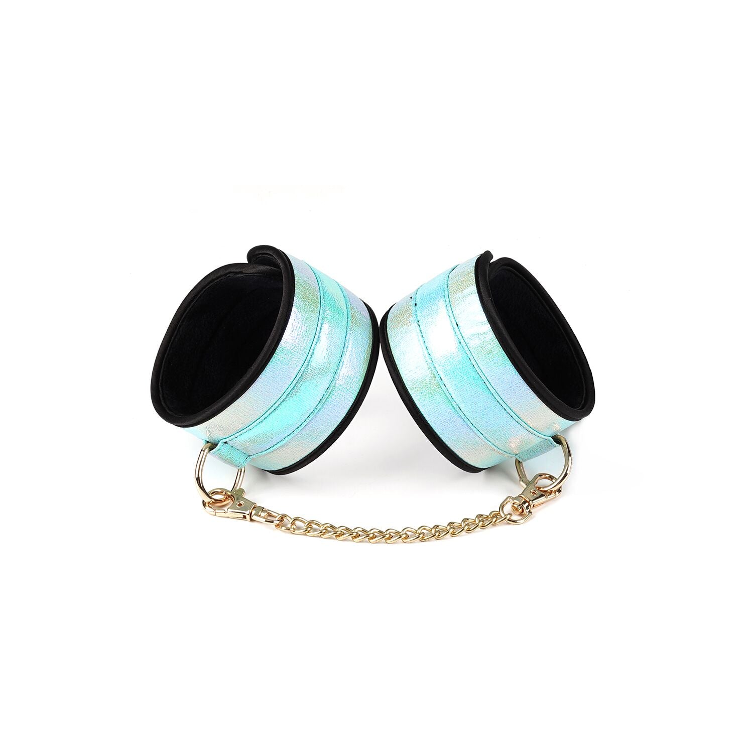 1. Наручники на липучці із з’єднувальним ланцюжком. Наручники з м’якою вставкою на оксамитовій основі будуть комфортно розміщуватись на руках, а широка липучка дає змогу регулювати їх за обсягом. Ланцюжок кріпиться на карабінах, так що ви легко можете зафіксувати руки на будь-якому об’єкті (ліжку, стільці тощо), а також з’єднати їх із ногами, нашийником або повідцем. Загальна довжина наручників: 24,5 см, ширина 6 см. Довжина ланцюжка 16 см.