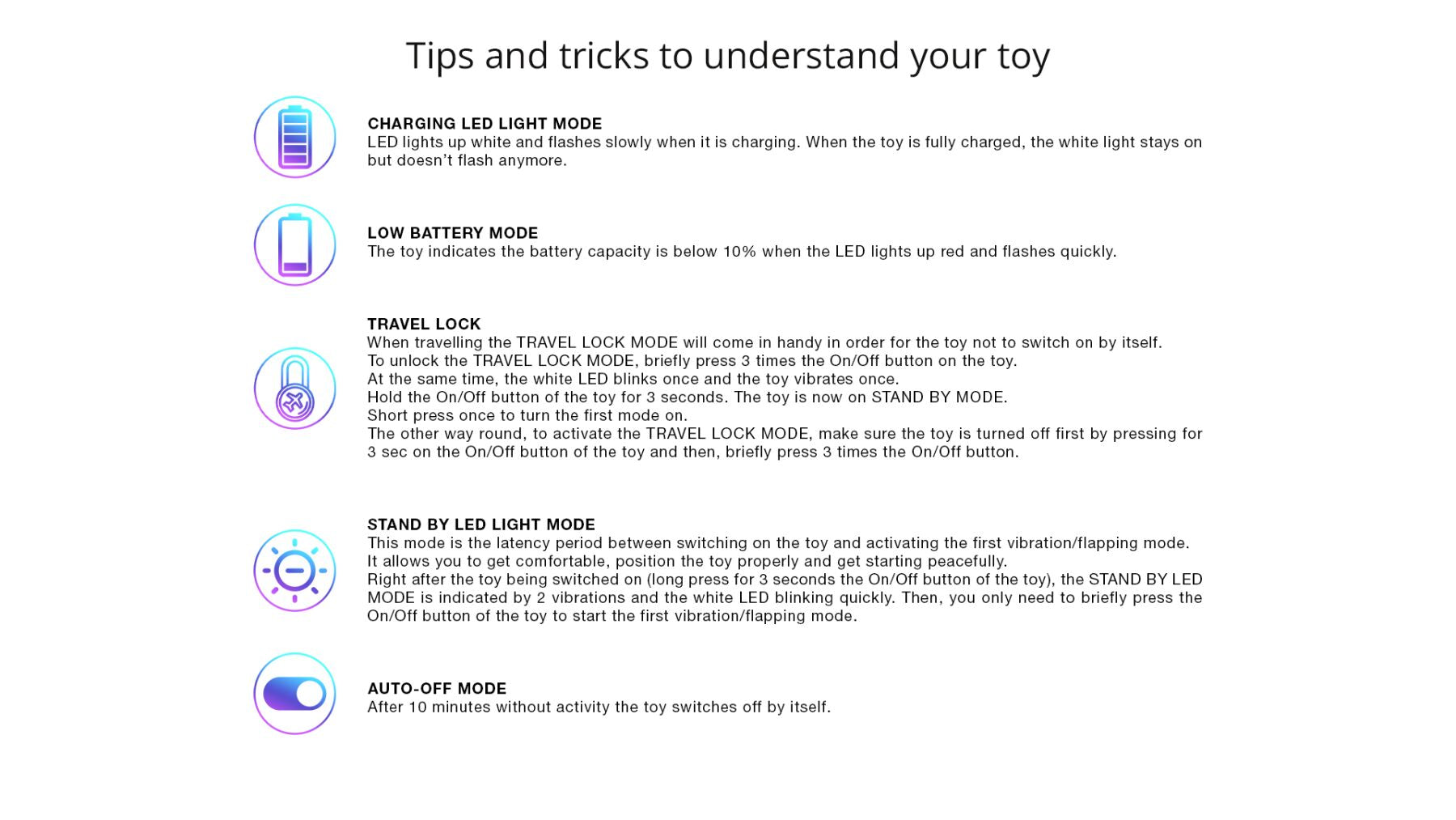 • блокування ввімкнення, щоб під час подорожі іграшка не ввімкнулася самостійно;