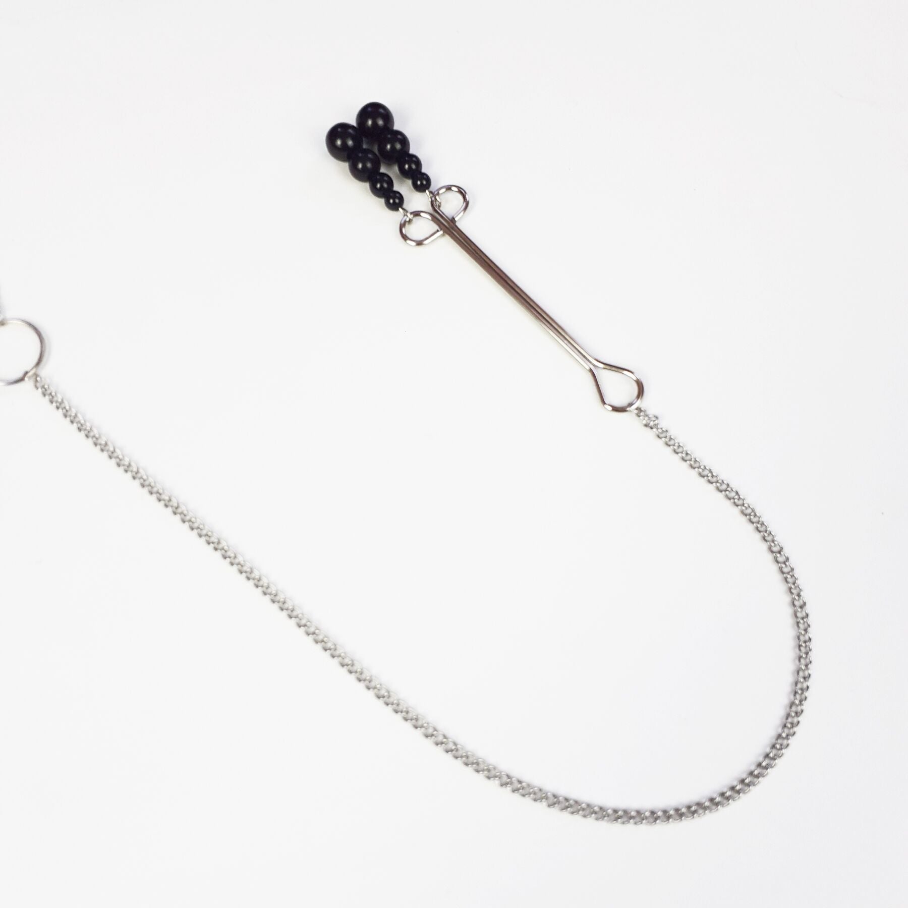Так, в інтимних прикрасах теж є свої тенденції та модні віяння. Затискачі з'єднані між собою тонким металевим ланцюжком і прикрашені чорними перлинами. Безпечну експлуатацію забезпечують м'які силіконові накладки.
