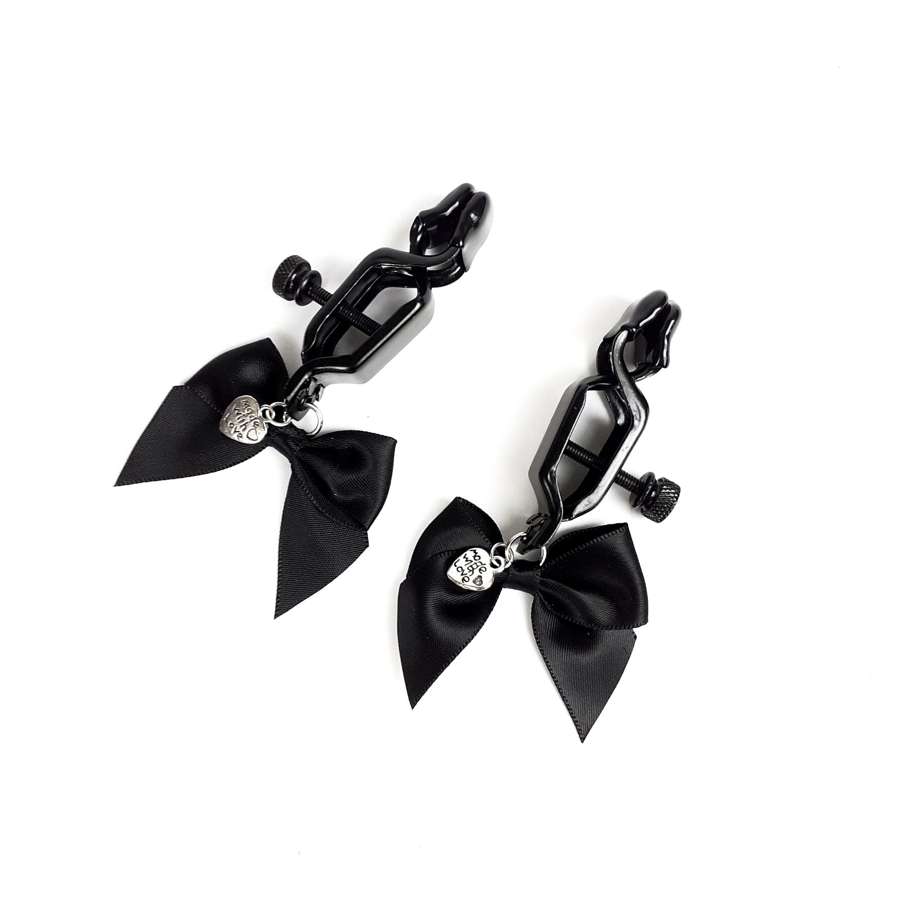 Затискачі оснащені гвинтиками для регулювання сили стиснення, щоб змінювати інтенсивність стимуляції на власний смак. Тканеві атласні бантики ідеально впишуться в будь-який образ, але особливо будуть доречні в комбінації з панчохами та нижньою білизною.