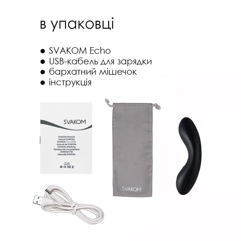 В упаковці: SVAKOM Echo + USB-кабель для заряджання + оксамитовий мішечок + інструкція.