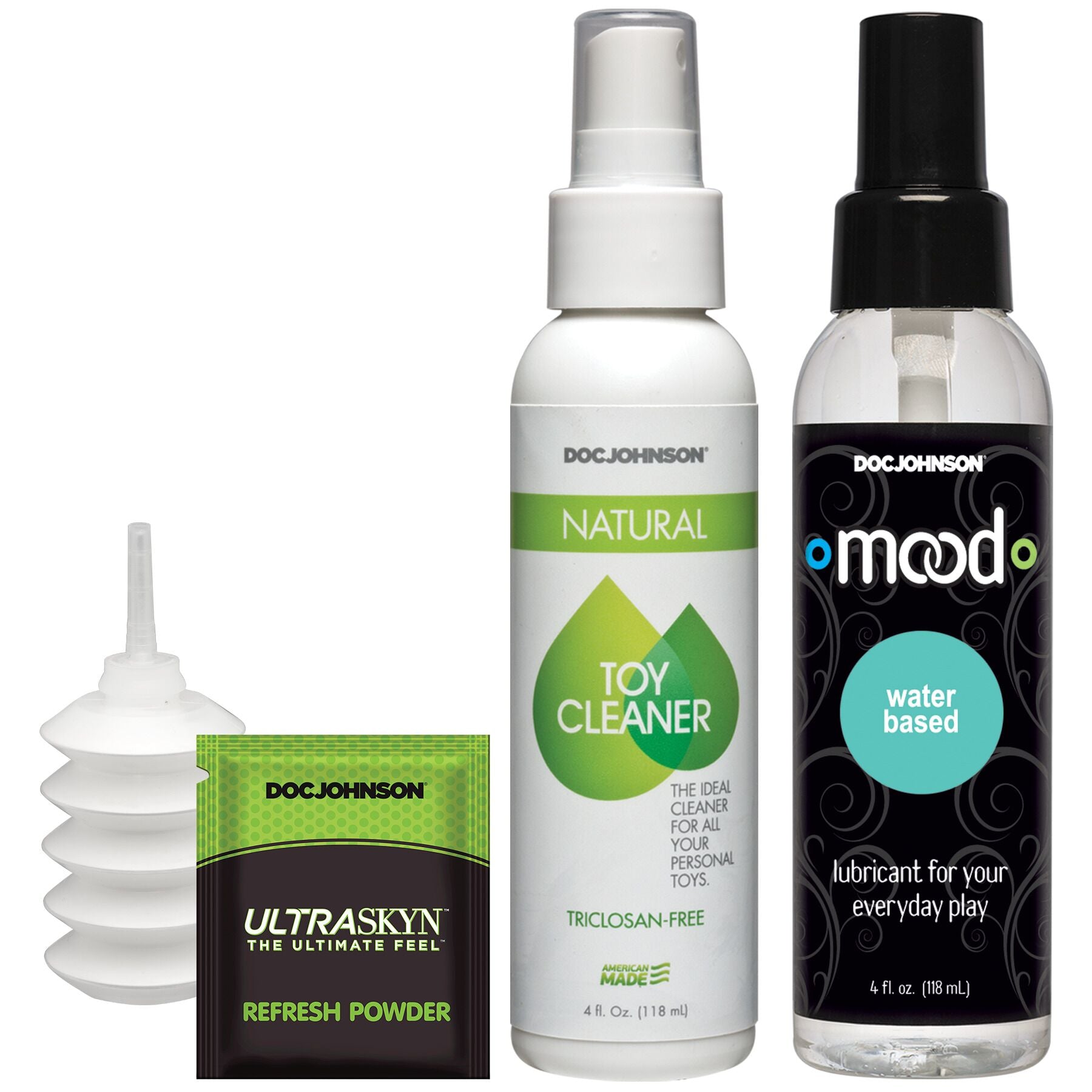• Дезінфекційний спрей Doc Johnson Natural Toy Cleaner (118 мл) без триклозану, сульфатів та парабенів — натуральний засіб на основі цитрусових олій. Рідина ефективно очищає іграшки та не псує їхній матеріал. Спрей представлений серед продукції бренду також окремим товаром.