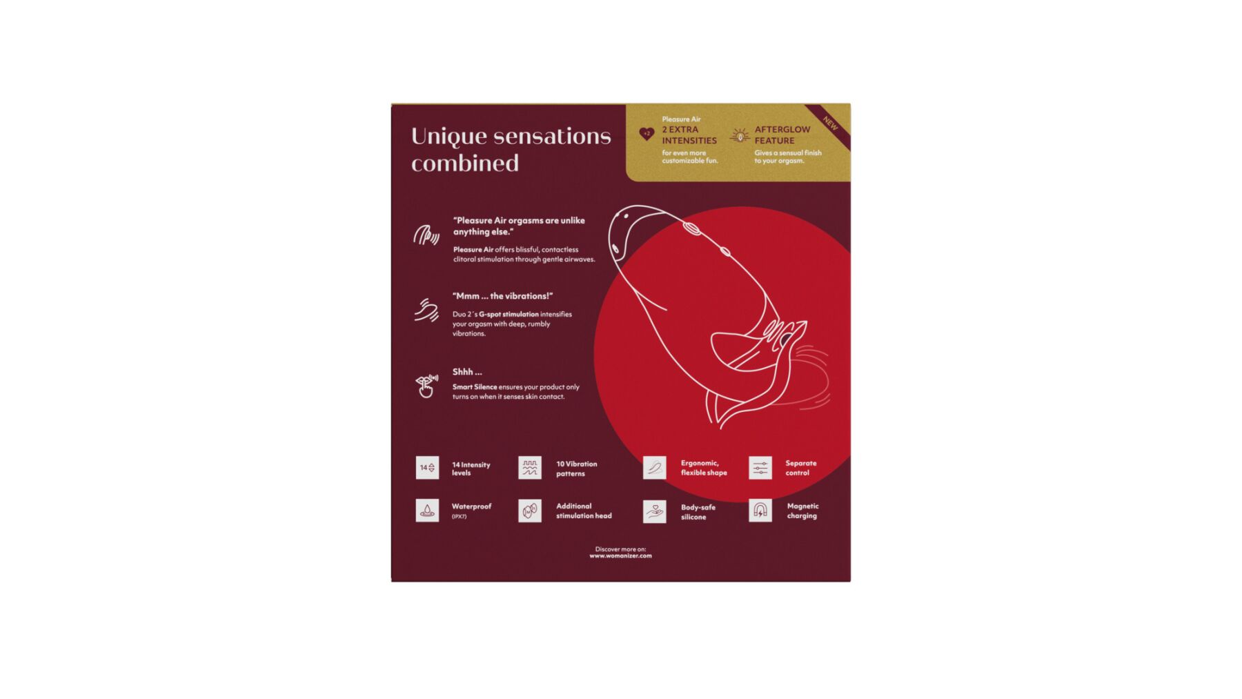 • функція Afterglow: унікальне рішення, що дає змогу подовжити оргазмічні відчуття (під час натискання кнопки Afterglow вмикається особливо ніжний вакуум для легких пестощів клітора для додаткового задоволення — спробувавши Afterglow один раз, ви більше не зможете від нього відмовитися!);