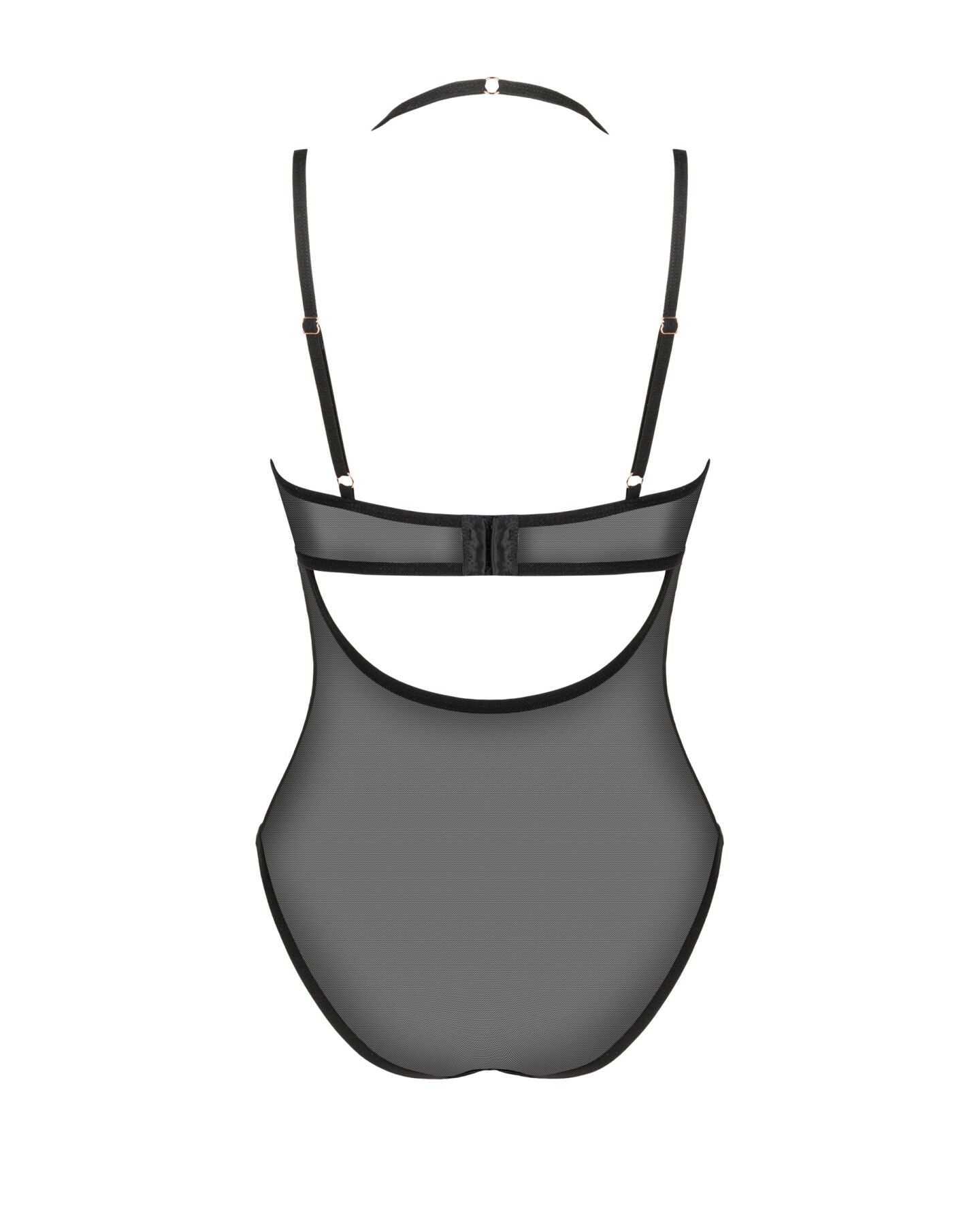 Боді Obsessive Selinne teddy з дрібної чорної сітки має простий та елегантний крій, ніжно обволікає тіло та відчувається як друга шкіра. Акцентом вбрання є цікавий дизайн чашки бюста, виділяються кісточки рожевого кольору, помітний кулончик із рожевого золота з логотипом бренду. Боді має подвійні регульовані бретелі, одні з них зав’язуються на шиї. Також комфортну посадку та підтримання грудей забезпечує багатоступенева застібка ззаду. Спокусливий вигляд спереду та виріз на спині гарантують вау-ефект!