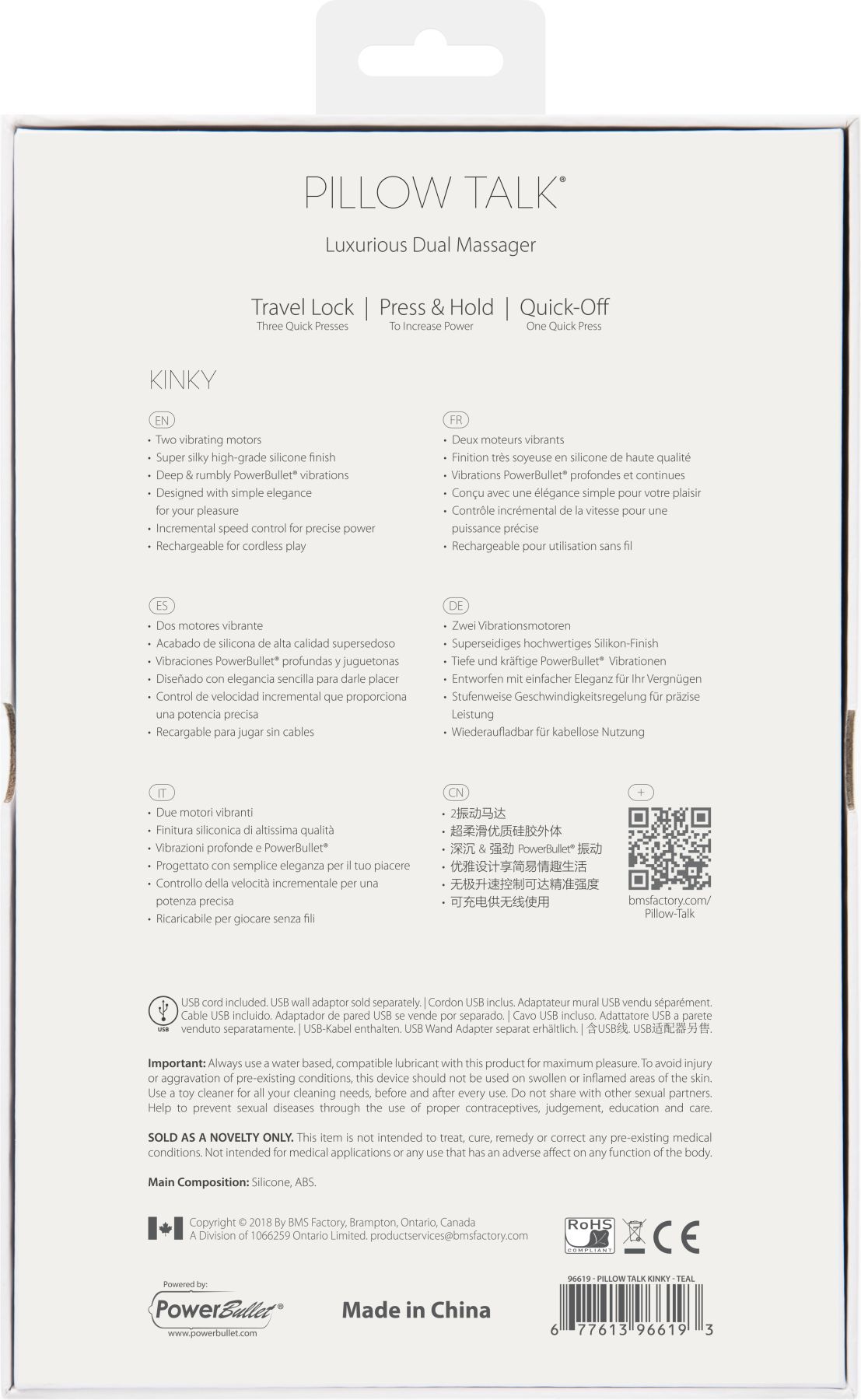 Пропонуємо купити розкішний вібратор Pillow Talk - Kinky Teal - абсолютно надзвичайну модель з двома моторами, яка здатна здивувати навіть самих просунутих цінительок вібраторів. Короноподобний гнучкий відросток буквально охопить ваш клітор ласками з усіх боків, а загнутий кінець вводиться частини буде ніжно (або інтенсивно - як ви захочете!) Стимулювати точку G. І довершує розкішну картину справжній кристал Swarovski, розташований на рукоятці вібратора.