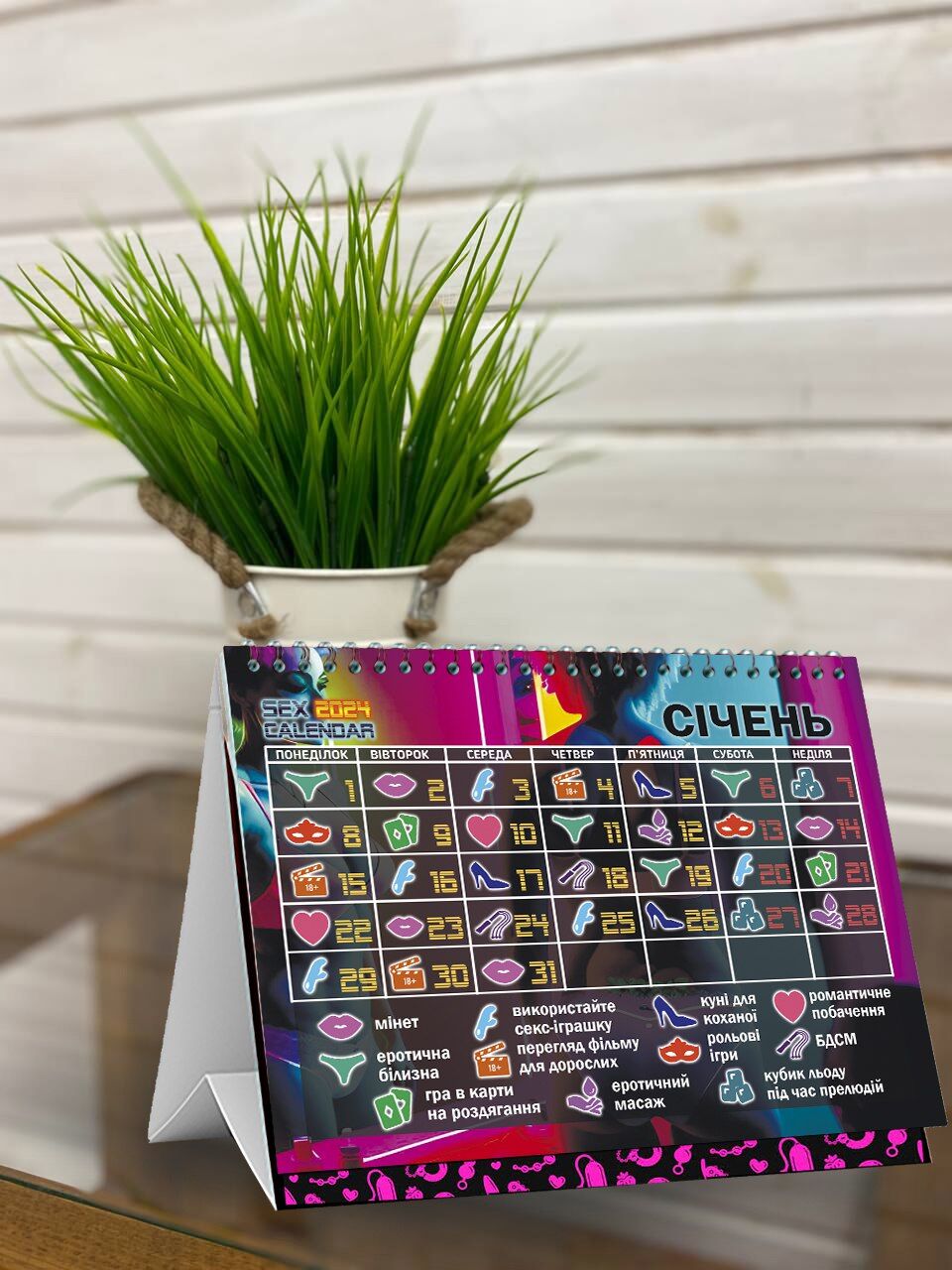 Пропонуємо купити SEX КАЛЕНДАР-2024 — оновлений календар для ваших найкращих еротичних пригод! Крутий і гарячий, він легко привнесе перчинку у вашу близькість. SEX КАЛЕНДАР-2024 ще цікавіший, ніж календар за 2023 рік. По-перше, календар виконаний у новому унікальному дизайні — жодних повторів, лише актуальне оформлення! По-друге, замість тексту в ньому використовуються іконки — умовні позначення активностей (з розшифровкою), що робить календар більш яскравим. І, по-третє, у ньому є ще більше ідей для еротичного дозвілля.